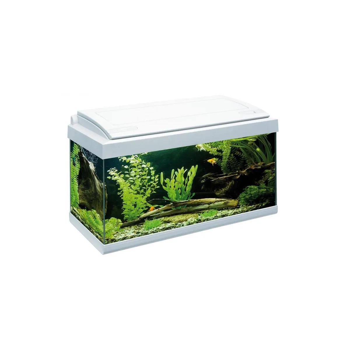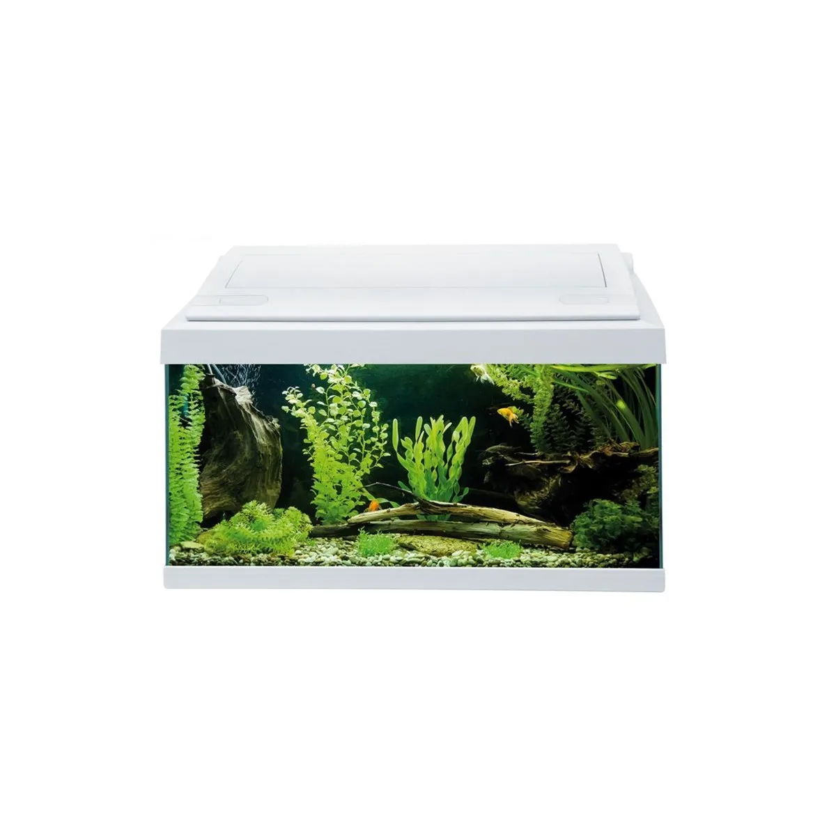 Acquario in vetro completo di coperchio plastico, sistema di illuminazione LED, filtro biologico, pompa di ricircolo e termoriscaldatore.