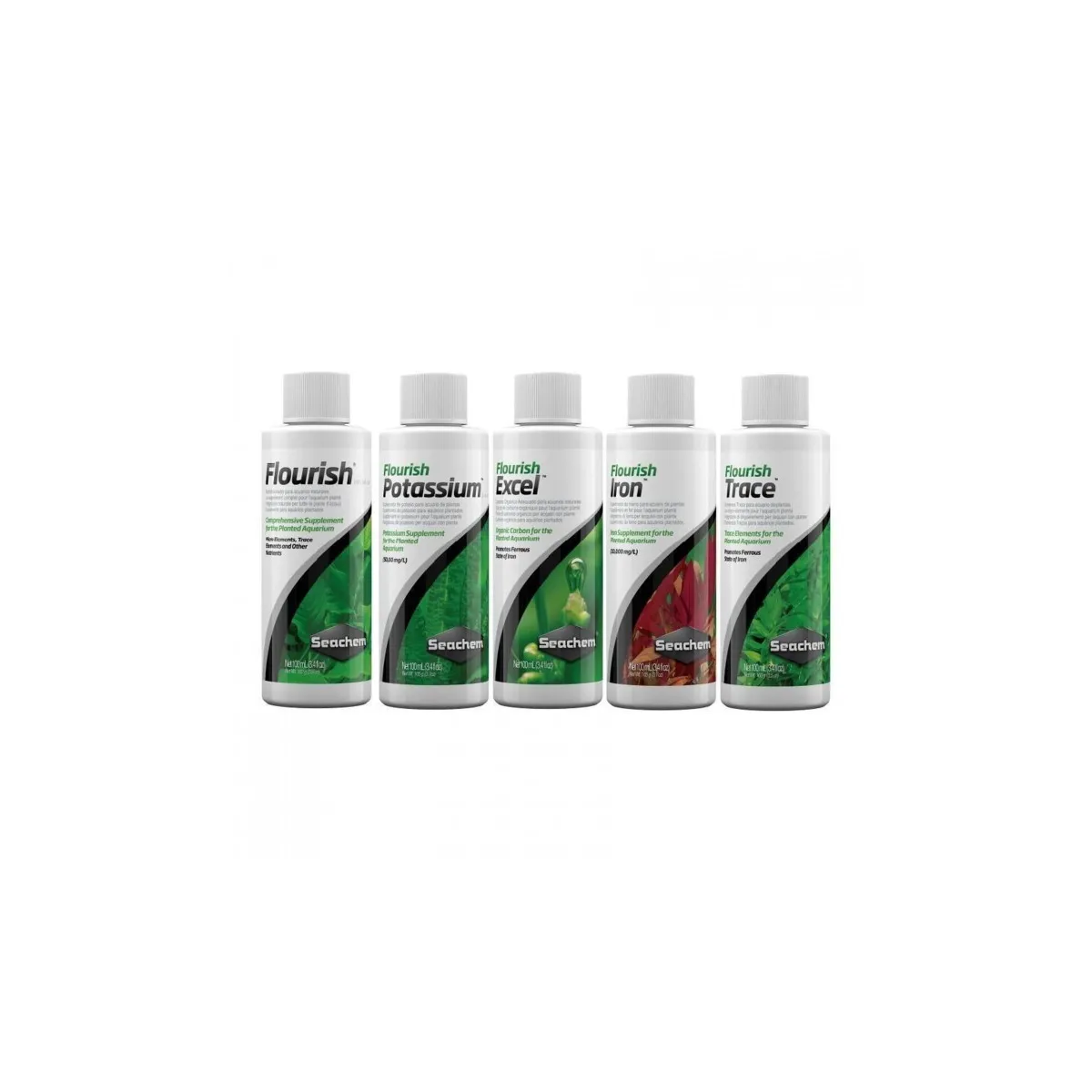Seachem protocollo base di fertilizzazione per piante d'acquario. Pacchetto completo dei fertilizzanti base: Flourish, Flourish Excel, Flourish Potassium, Flourish Iron e Flourish trace.