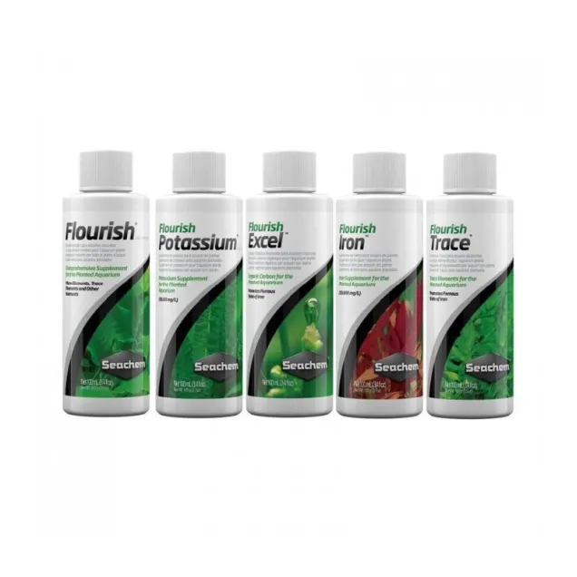 Seachem protocollo base di fertilizzazione per piante d'acquario. Pacchetto completo dei fertilizzanti base: Flourish, Flourish Excel, Flourish Potassium, Flourish Iron e Flourish trace.