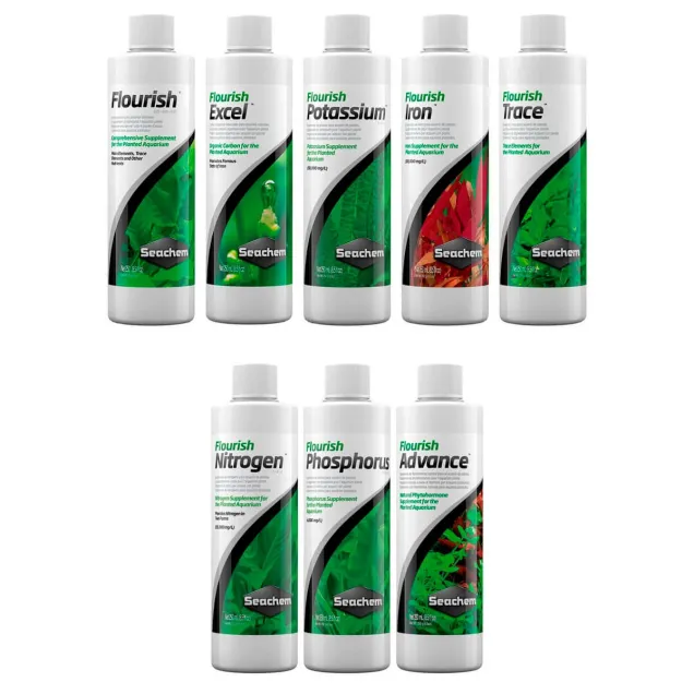 Seachem protocollo base di fertilizzazione per piante d'acquario. Pacchetto completo dei fertilizzanti: Flourish, Flourish Excel, Flourish Potassium, Flourish Iron, Flourish Trace, Flourish Nitrogen, Flourish Phosphorus e Flourish Advance.