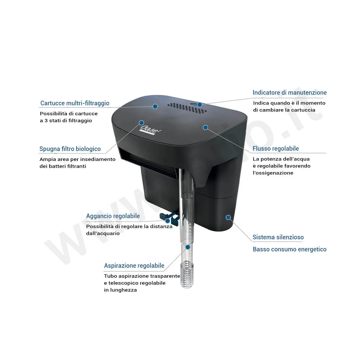 Oltre al processo di filtraggio e alla potenza variabile dell'acqua da lenta a molto forte, che favorisce anche lo scambio di gas sulla superficie dell'acqua, il filtro a zainetto BioStyle funziona in modo molto silenzioso. Una caratteristica molto speciale del filtro è il suo indicatore di manutenzione automatico che avvisa quando è necessario sostituire la cartuccia.