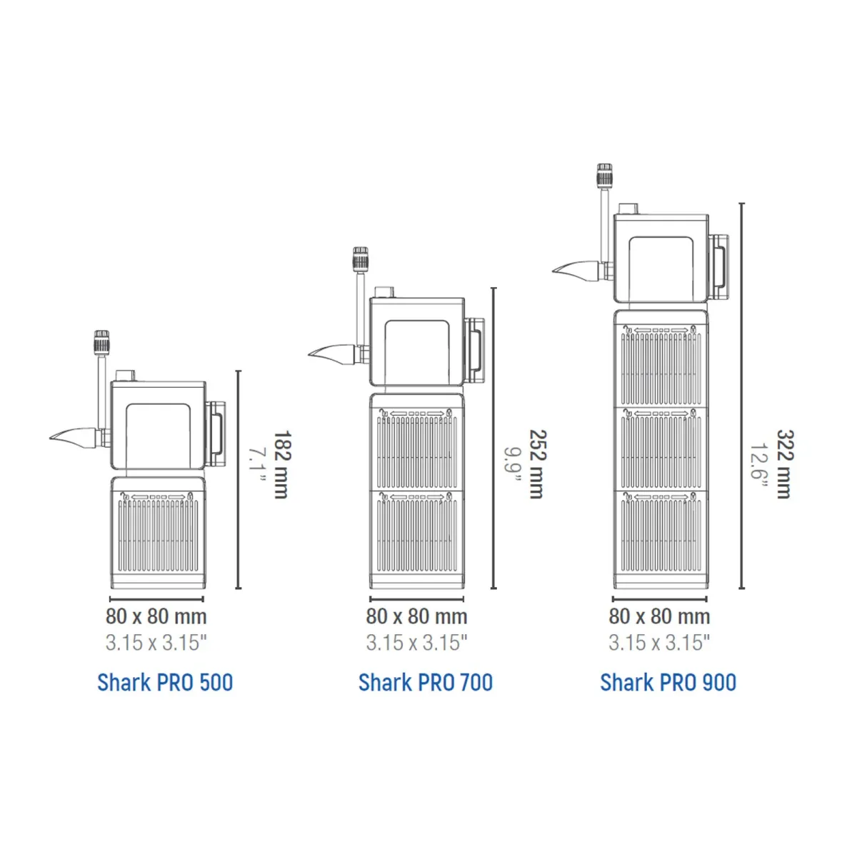- Versatilità di Posizionamento: Utilizzabili sia orizzontalmente che verticalmente, i filtri SHARK PRO sono adatti per qualsiasi configurazione di acquario.