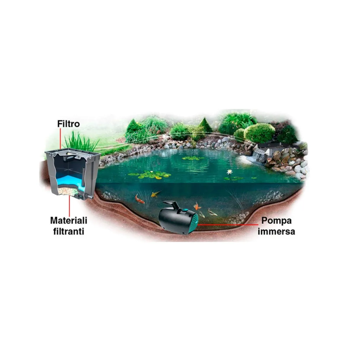 La pompa per laghetto inclusa è la Newa Cascata Adv 45000, con una prevalenza di 3,10 metri pompa per acque sporche progettata con motore a basso consumo 50 W e dotata di controllo elettronico per l’analisi delle condizioni di funzionamento, con cavo elettrico di 10 metri.