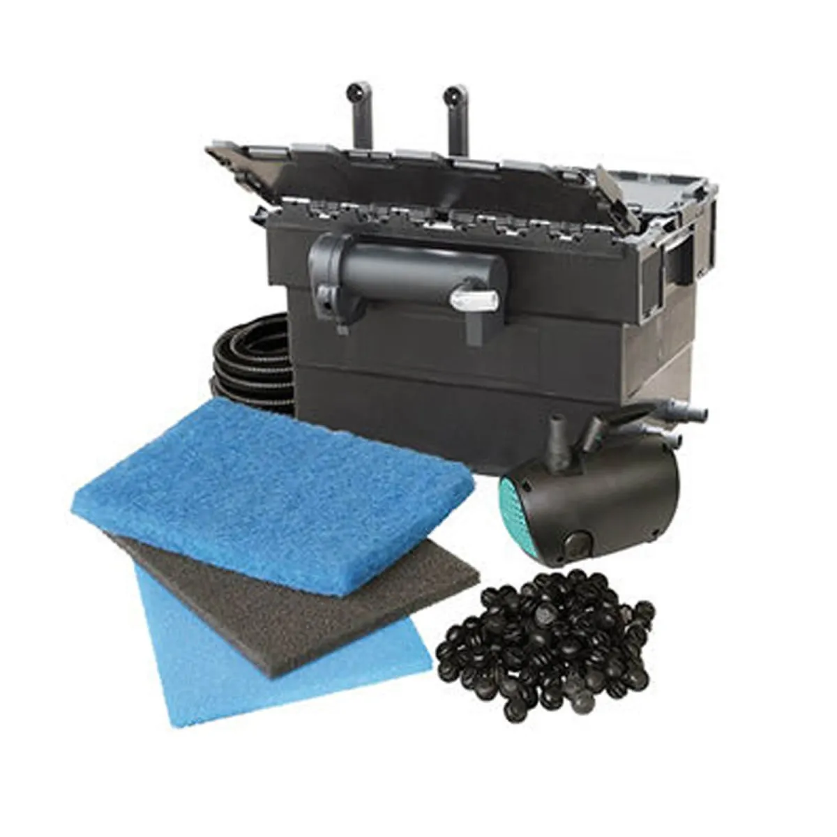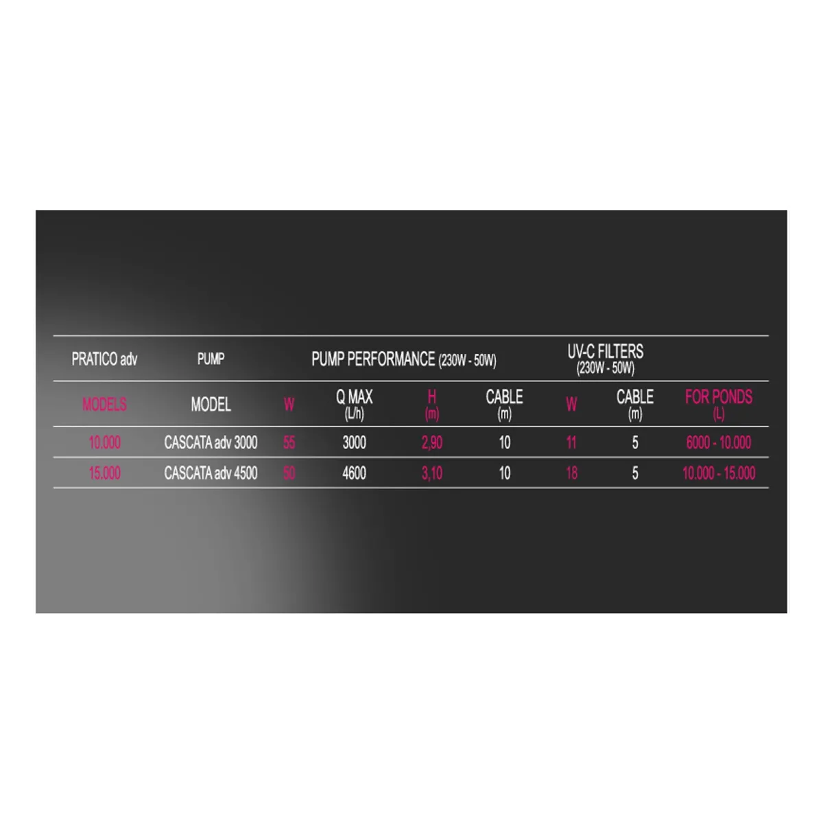 Filtro per laghetto Pratico 15000 Advance completo di lampada UV sterilizzatrice. Completo di pompa e materiale filtrante, adatto anche per laghetti con tartarughe.