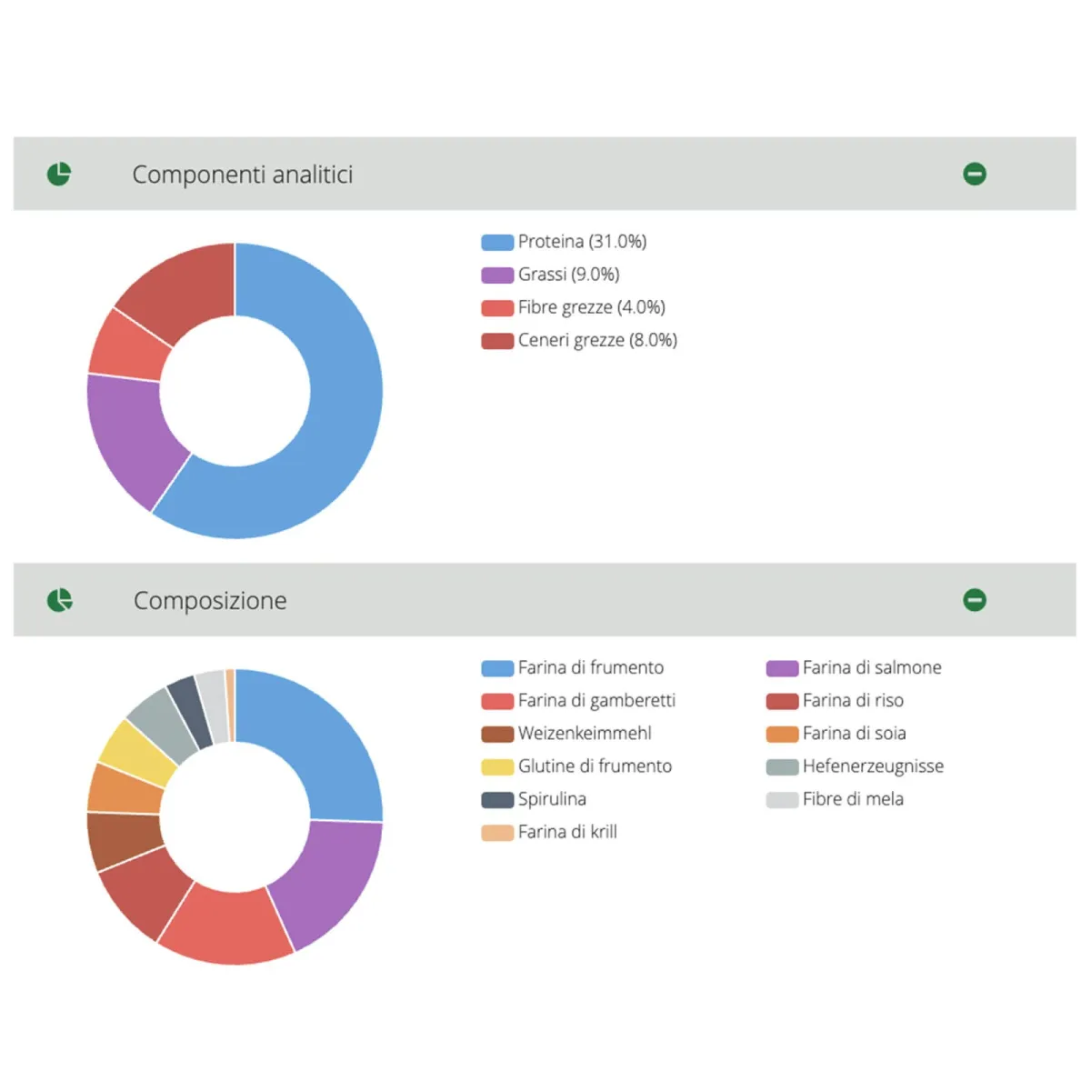 - Composizione: 31% proteine, 9% grassi, 4% fibre grezze, 8% ceneri grezze