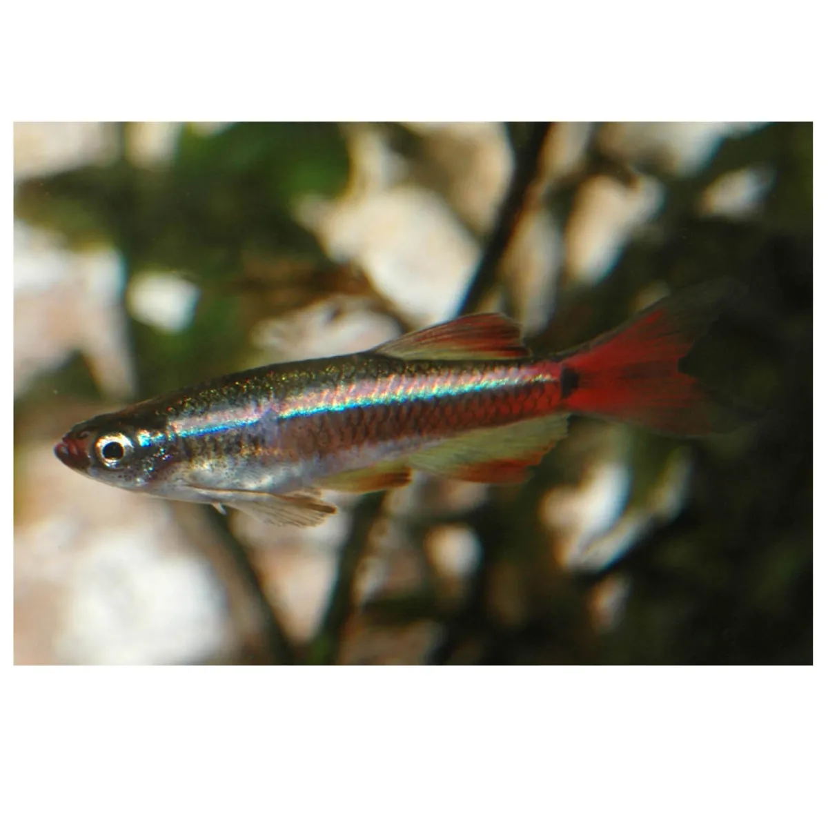 Il Tanichthys Albonubes è un piccolo pesce d'acquario dal corpo fusiforme e slanciato, livrea di color bronzo e con una riga turchese iridescente. Le pinna dorsale e caudale ha un bel colore rosso intenso che rende questo pesce veramente affascinante.