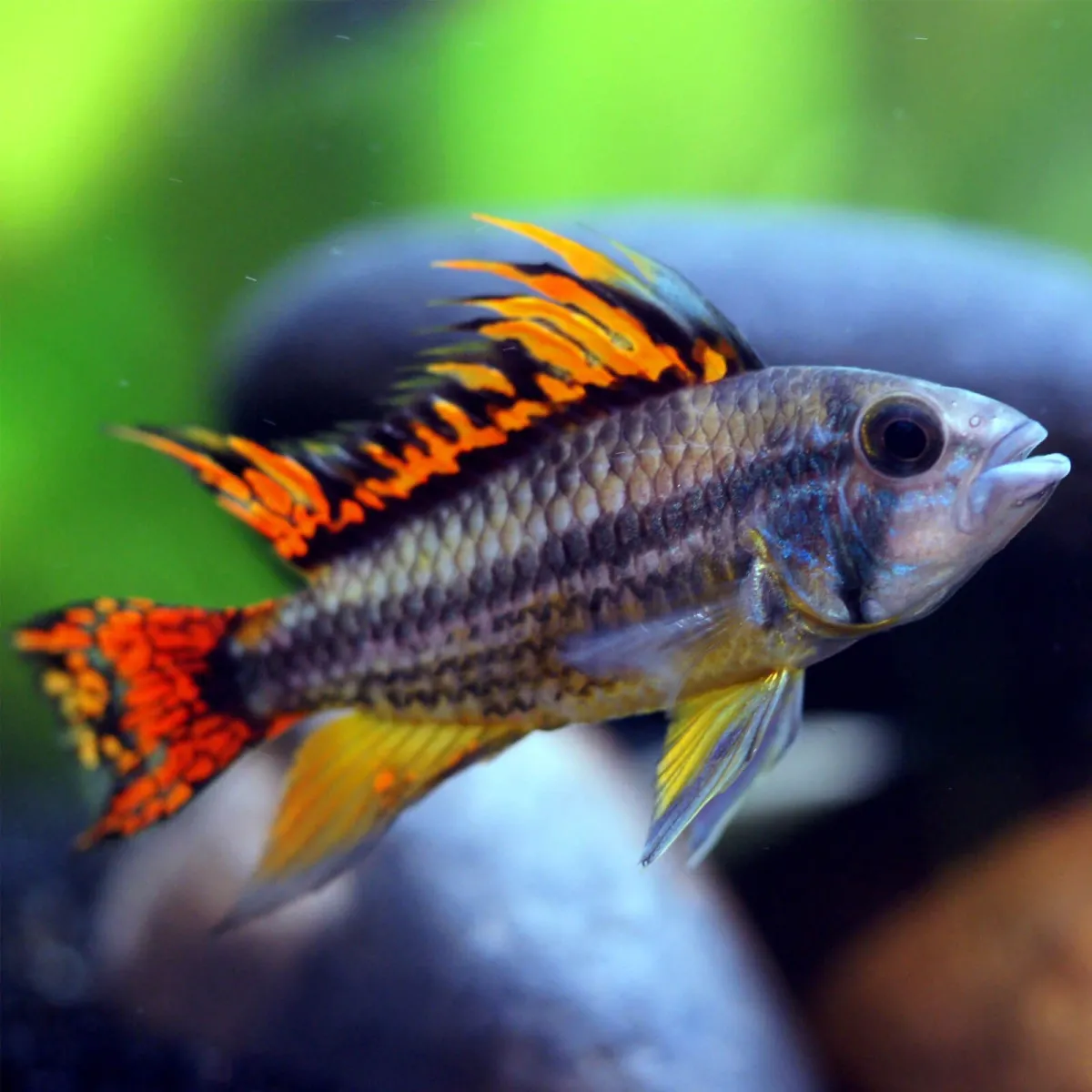 L' Apistogramma cacatuoides è un ciclide con origine nei torrenti del Sud American, la parte posteriore della pinna dorsale, così come la coda, sono di un colore acceso arancione tendente al rosso.