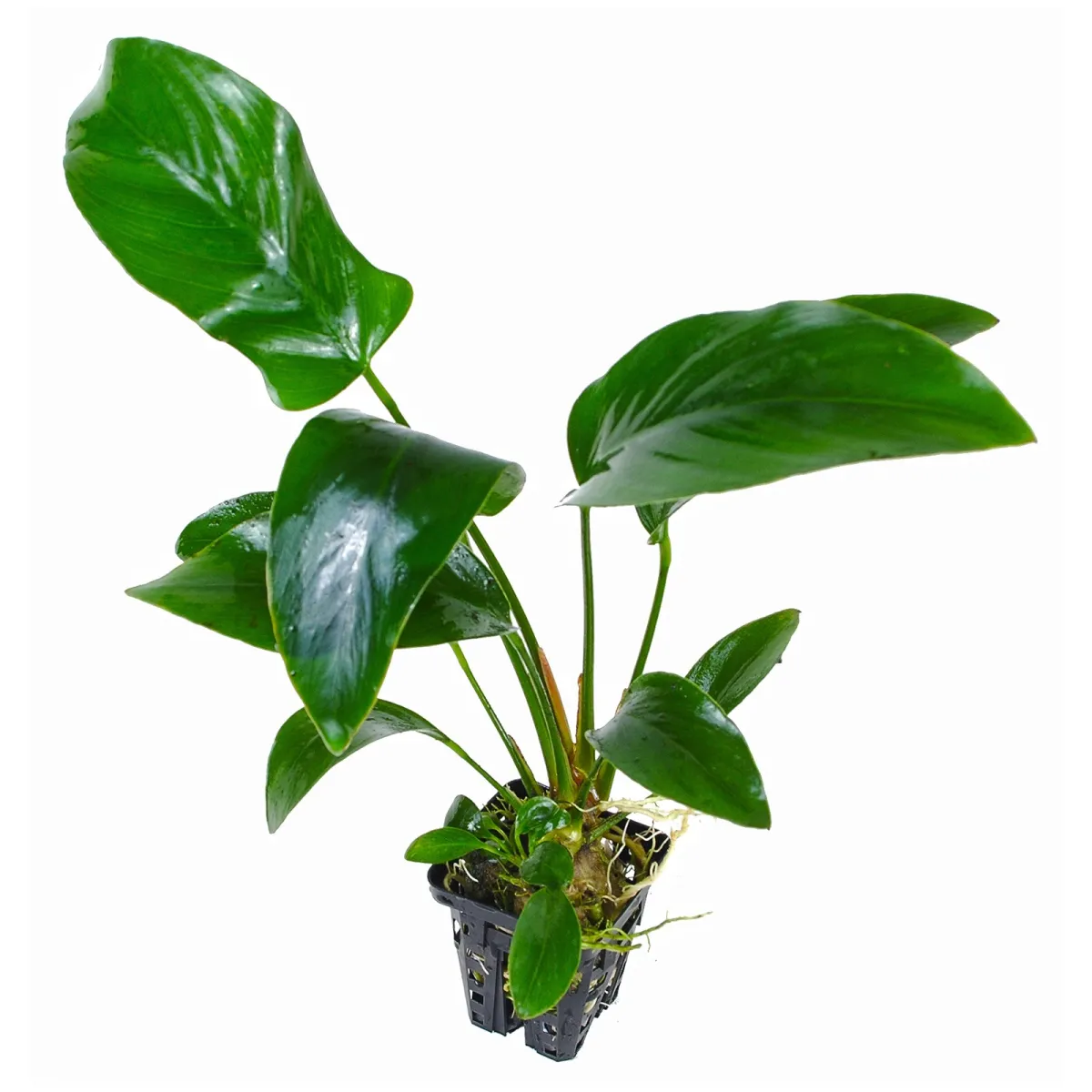 L'Anubias hastifolia è indicata per lo sfondo degli acquari più grandi. I suoi lunghi piccioli e la forma della base delle foglie non passano inosservati.
