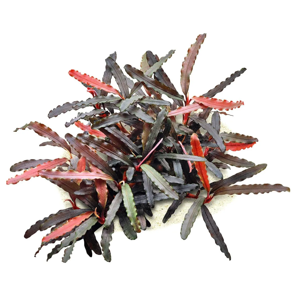 Pianta epifita in vitro a crescita lenta con foglie ramate e margini ondulati. Bucephalandra 'Catharinae' è ideale per il primo piano di acquari maturi.
