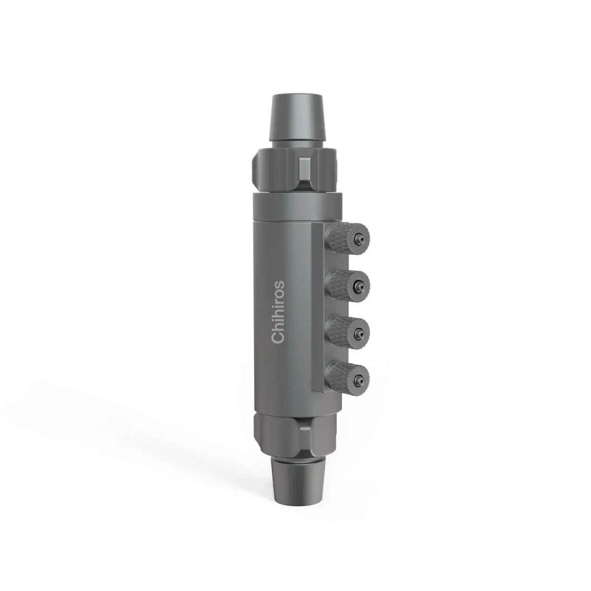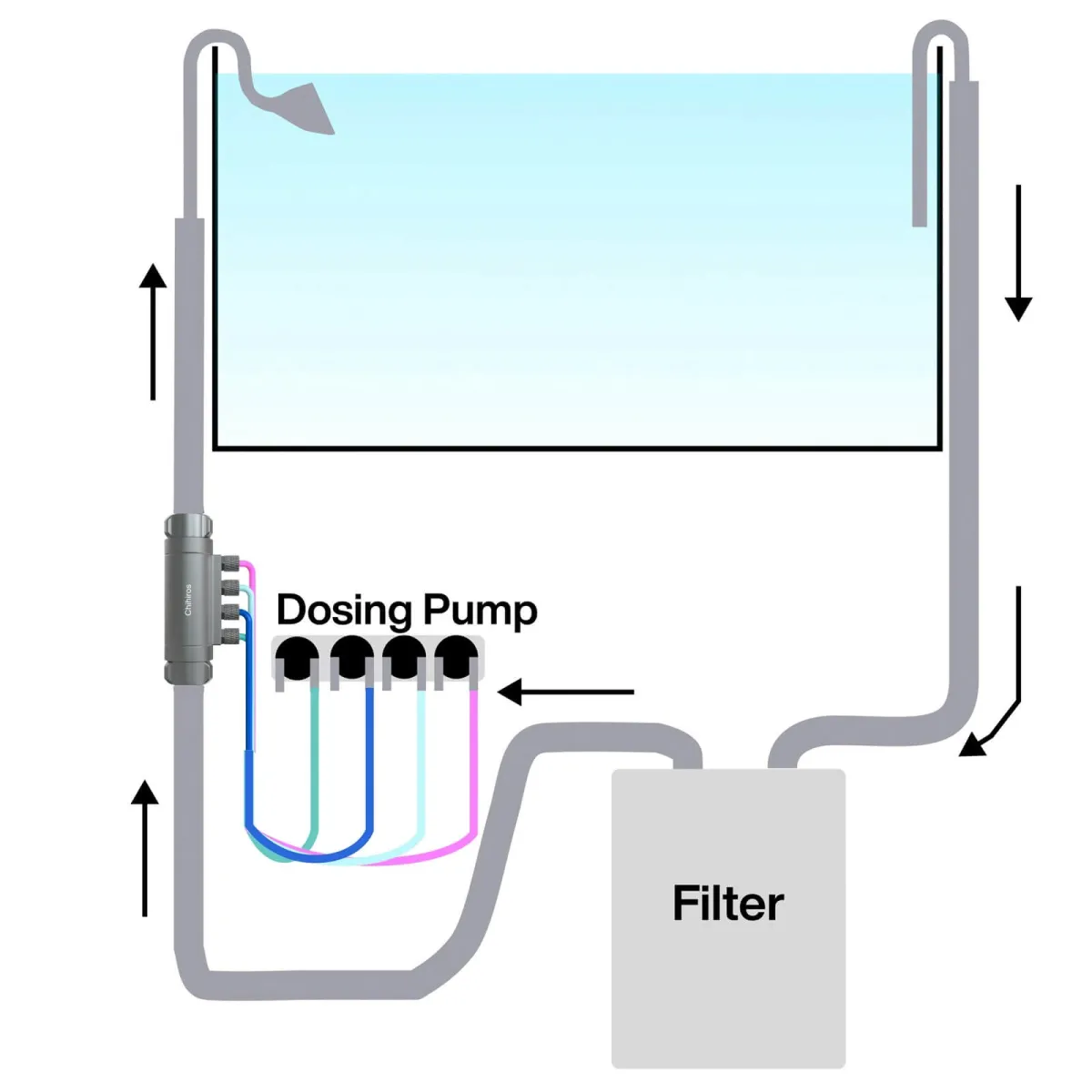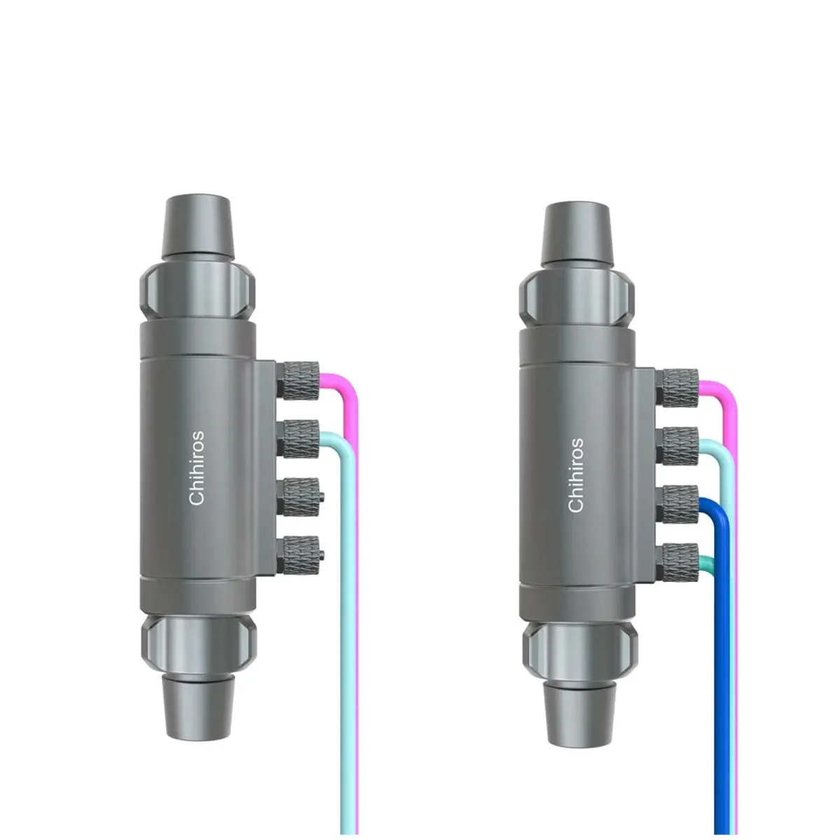Adattatore Chihiros in lega di alluminio con 4 porte dosometriche e valvole di non ritorno. Si collega al tubo del filtro per una fertilizzazione sicura e ordinata.