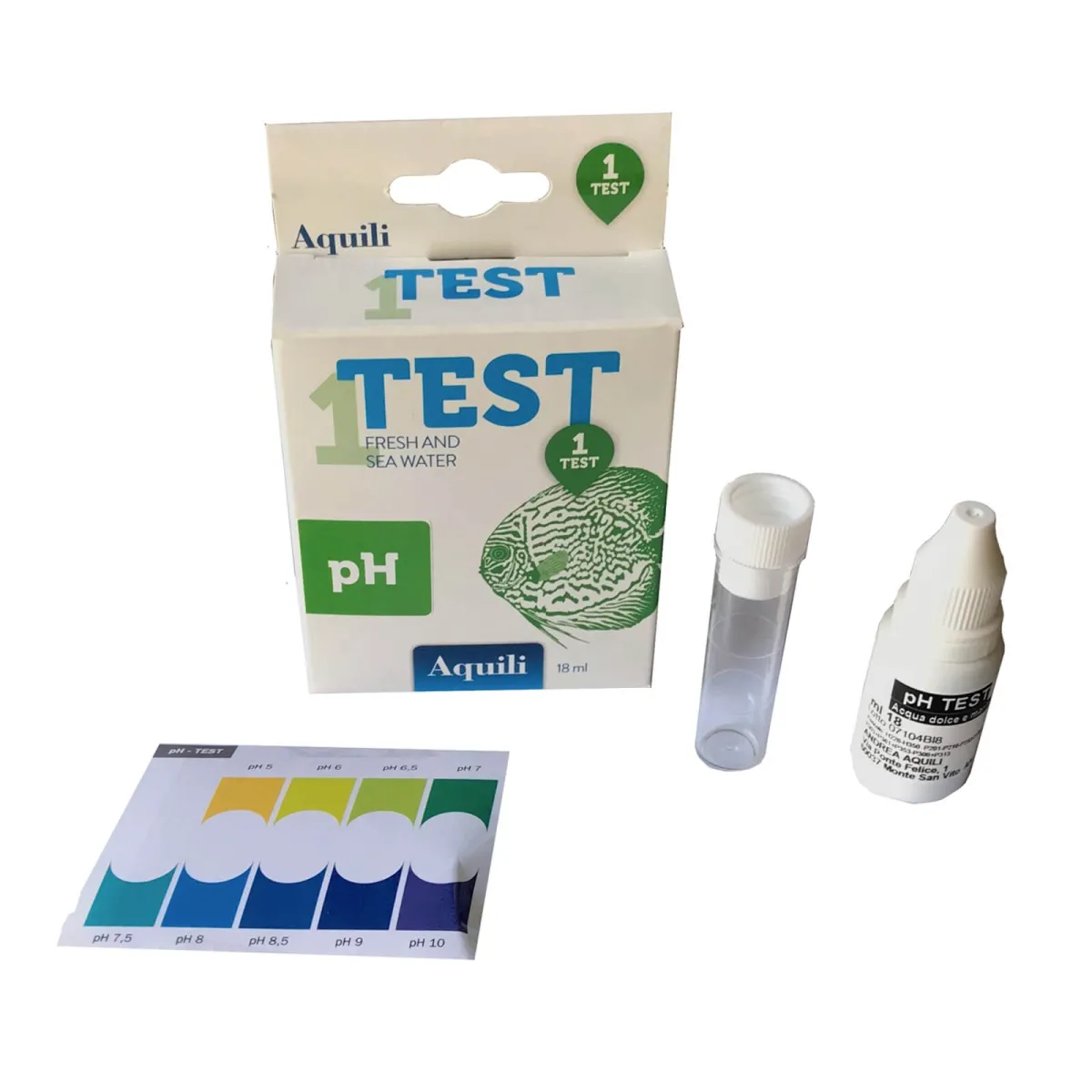 Aquili test PH per acquario dolce e marino, il test a reagente permette di misurare in modo semplice ma preciso il valore del PH in acquario. Contiene reagente liquido da 18 ml, provetta per la misurazione e scala colometrica.
